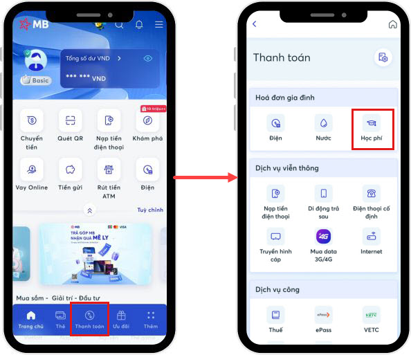 Ví dụ: Nhà trường liên kết hình thức thu hộ qua ứng dụng MB Bank của Ngân hàng MB, anh chị thao tác như sau:
