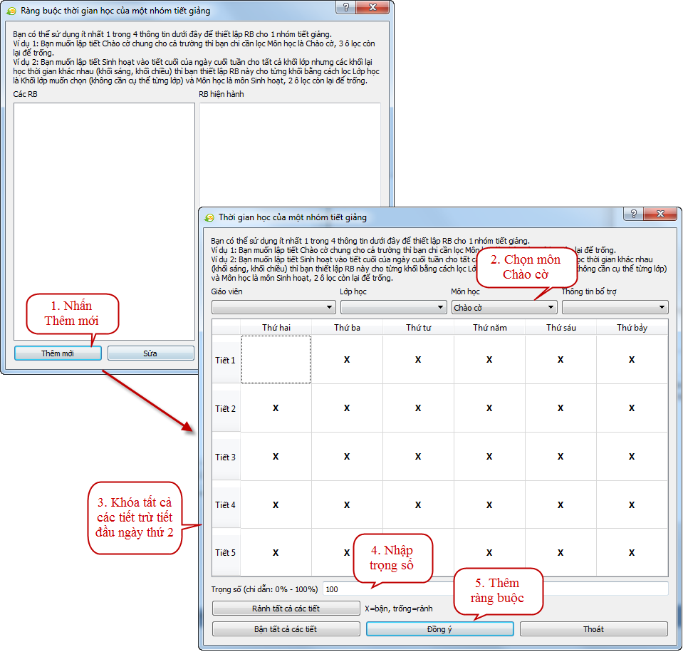 Tiết chào cờ và tiết sinh hoạt thường là 2 tiết cố định trong tuần, tiết chào cờ vào đầu giờ thứ 2 và tiết sinh hoạt vào cuối giờ thứ 7. Để thiết lập cho 2 tiết này cố định, hiệu trưởng thực hiện như sau: