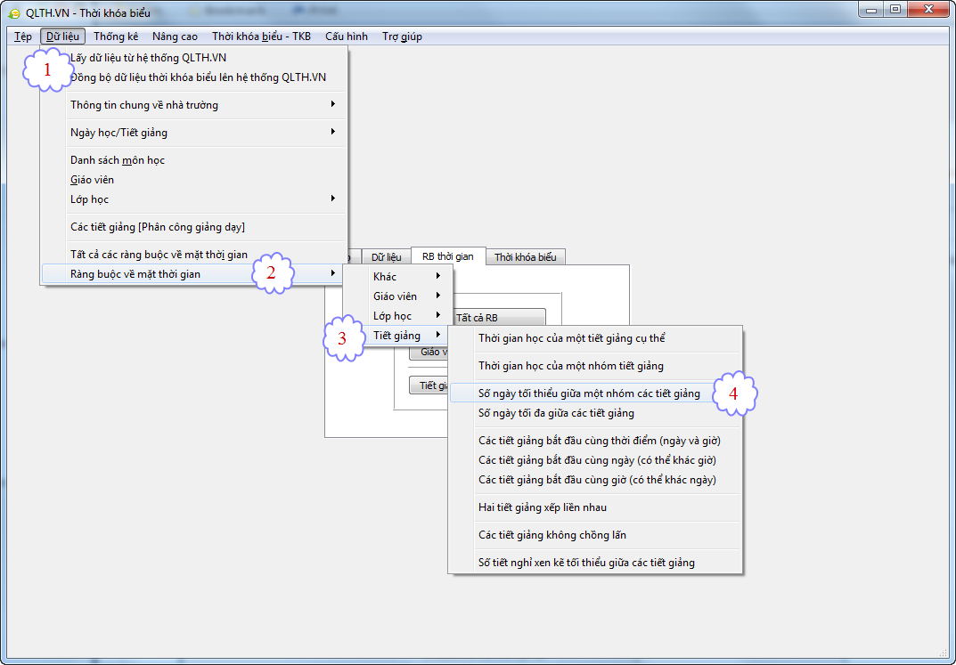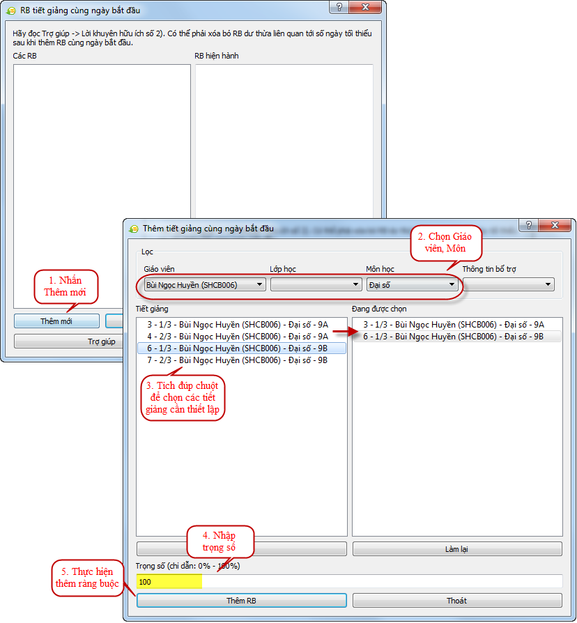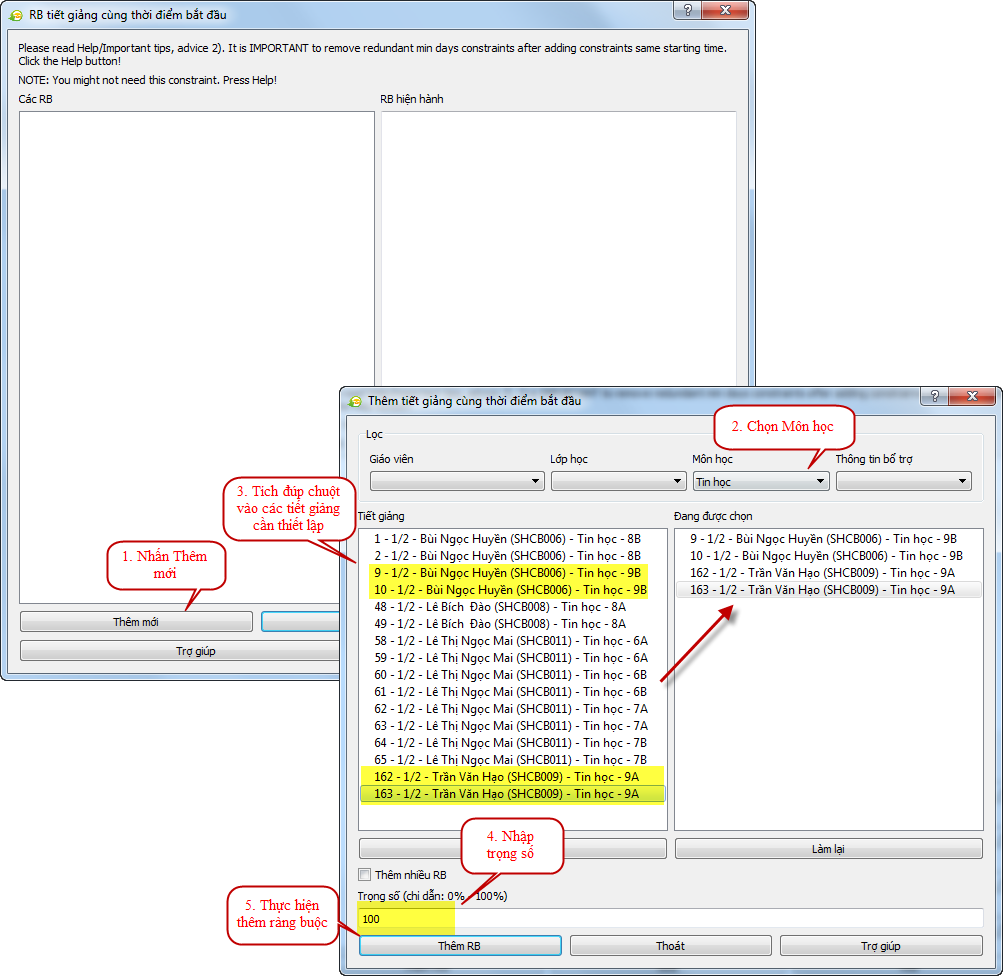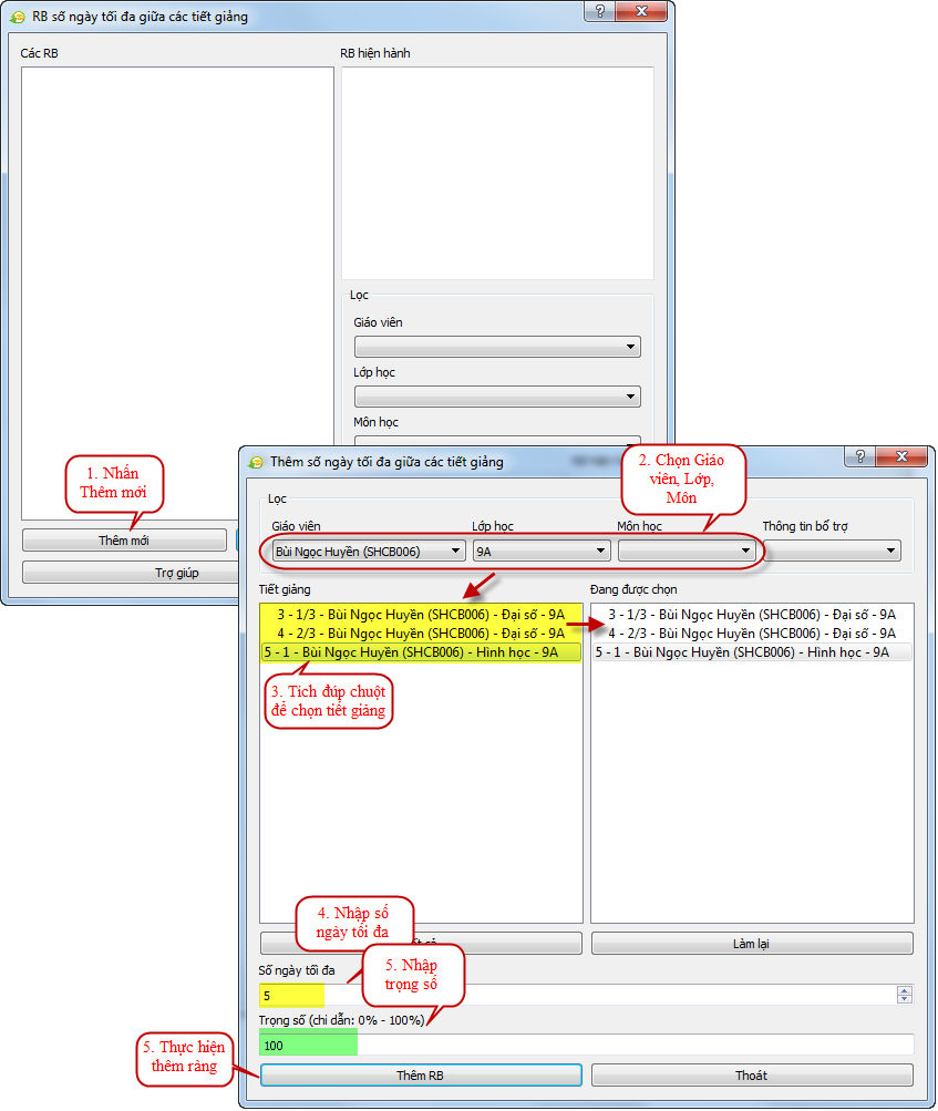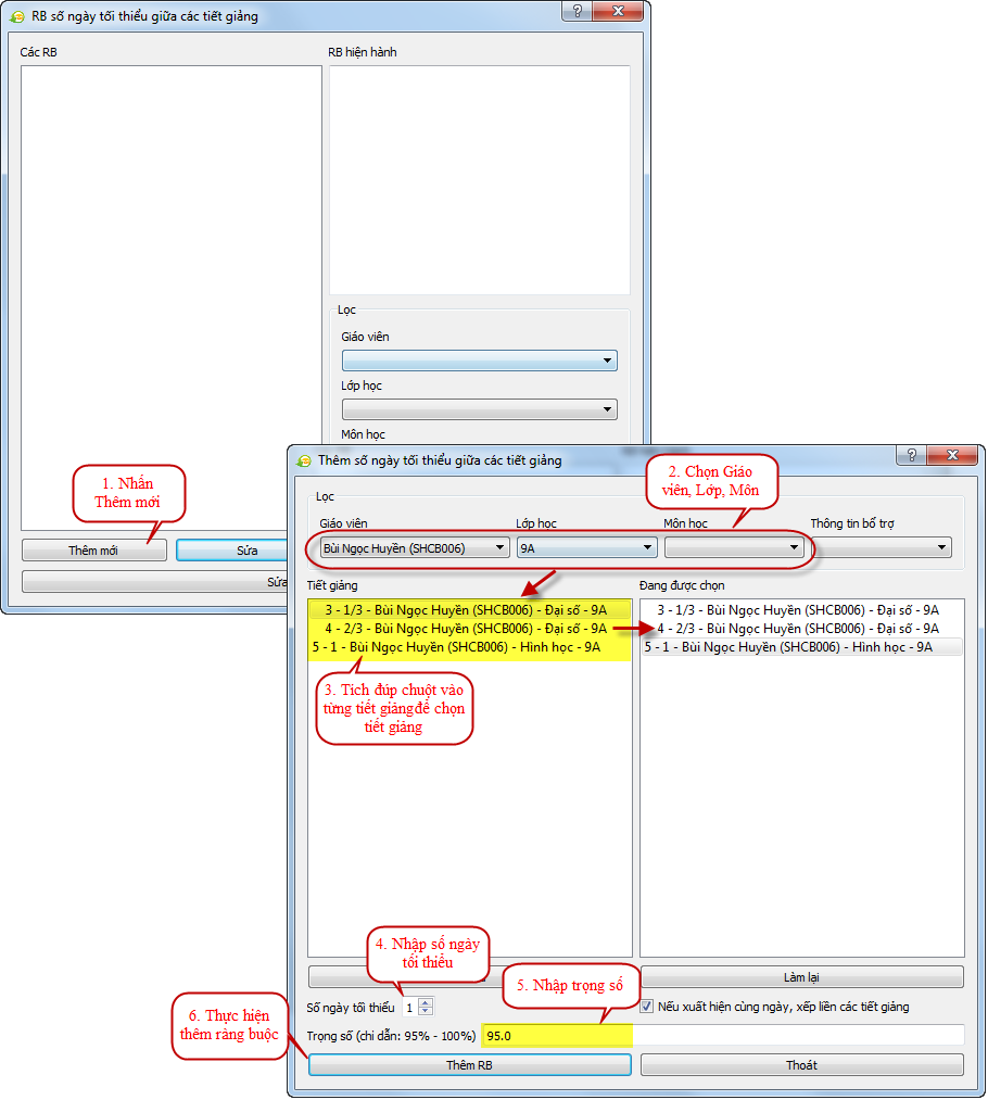 Ràng buộc này để tránh cho học sinh phải học liên tục 1 môn học trong những ngày gần nhau. Việc thiết lập được thực hiện như sau: