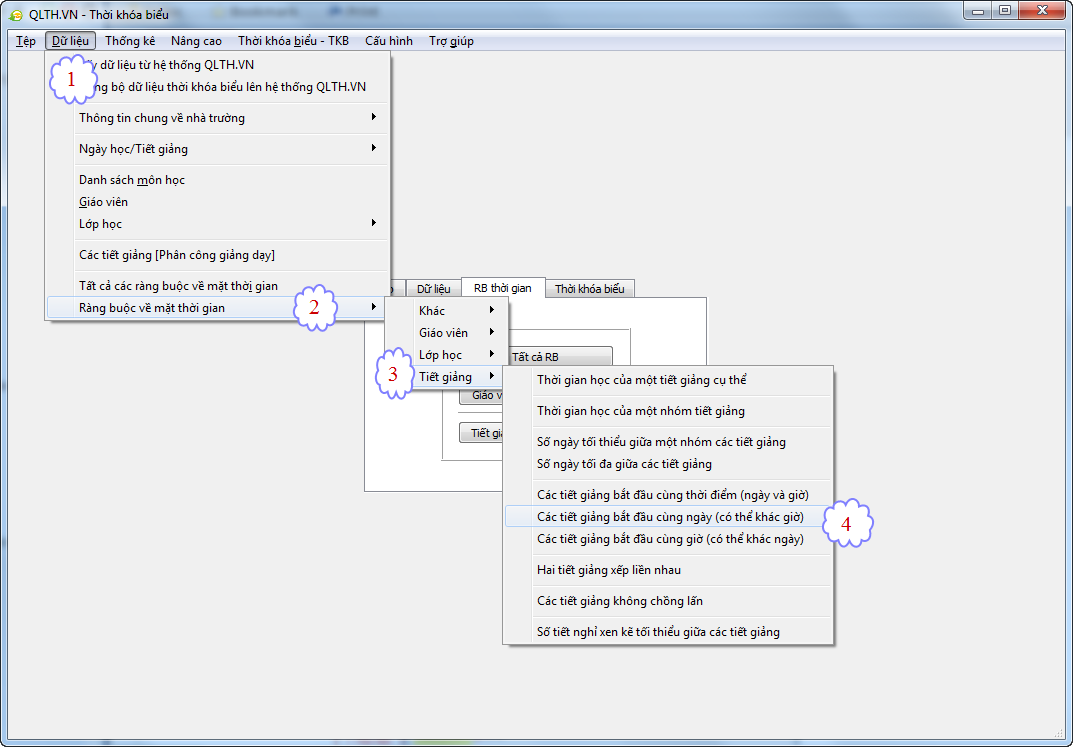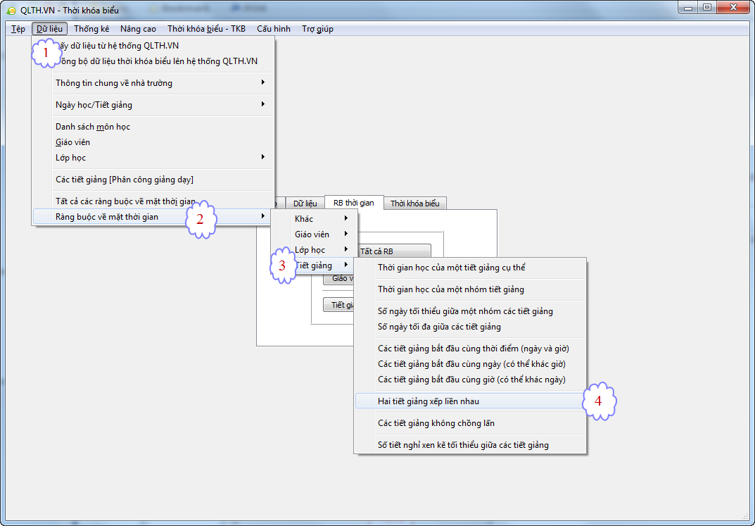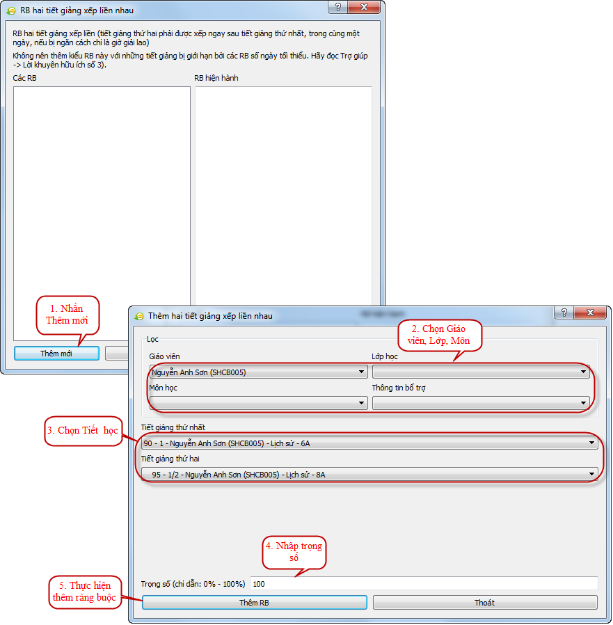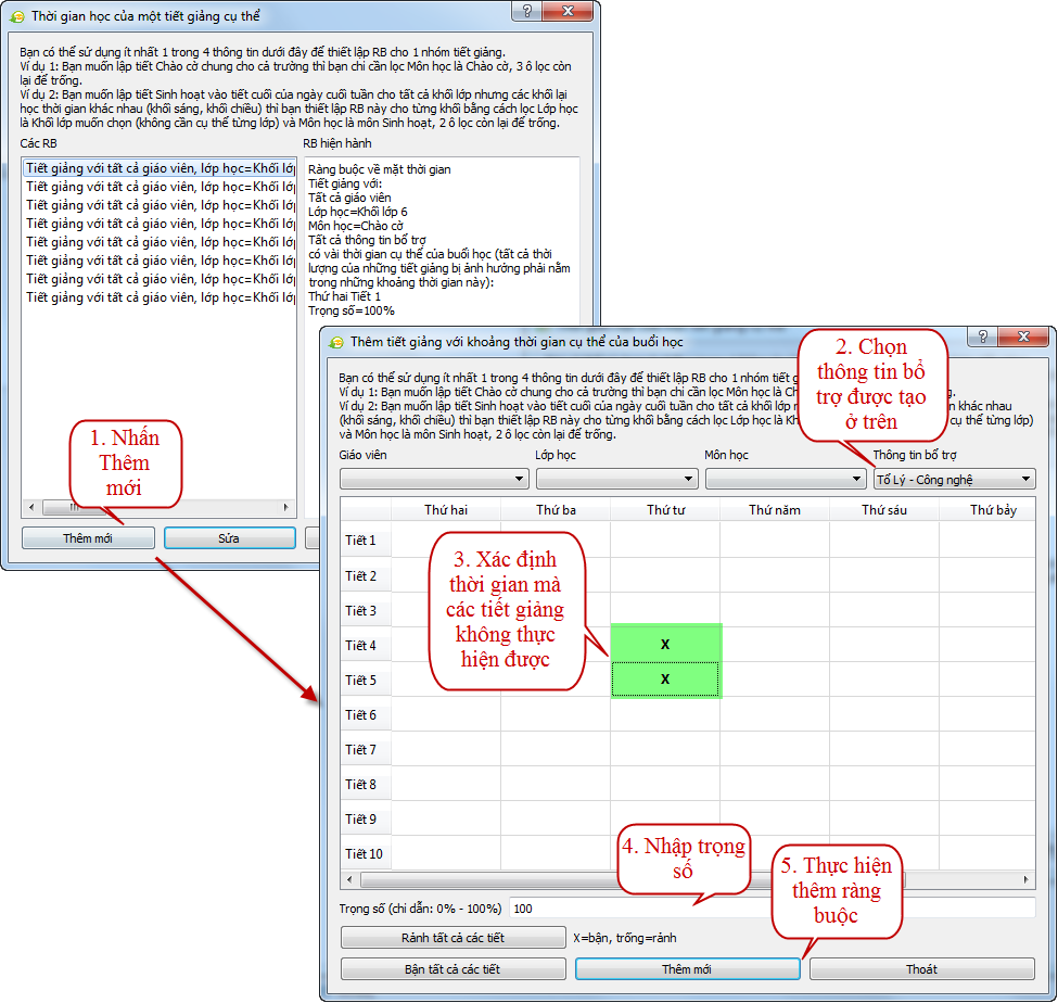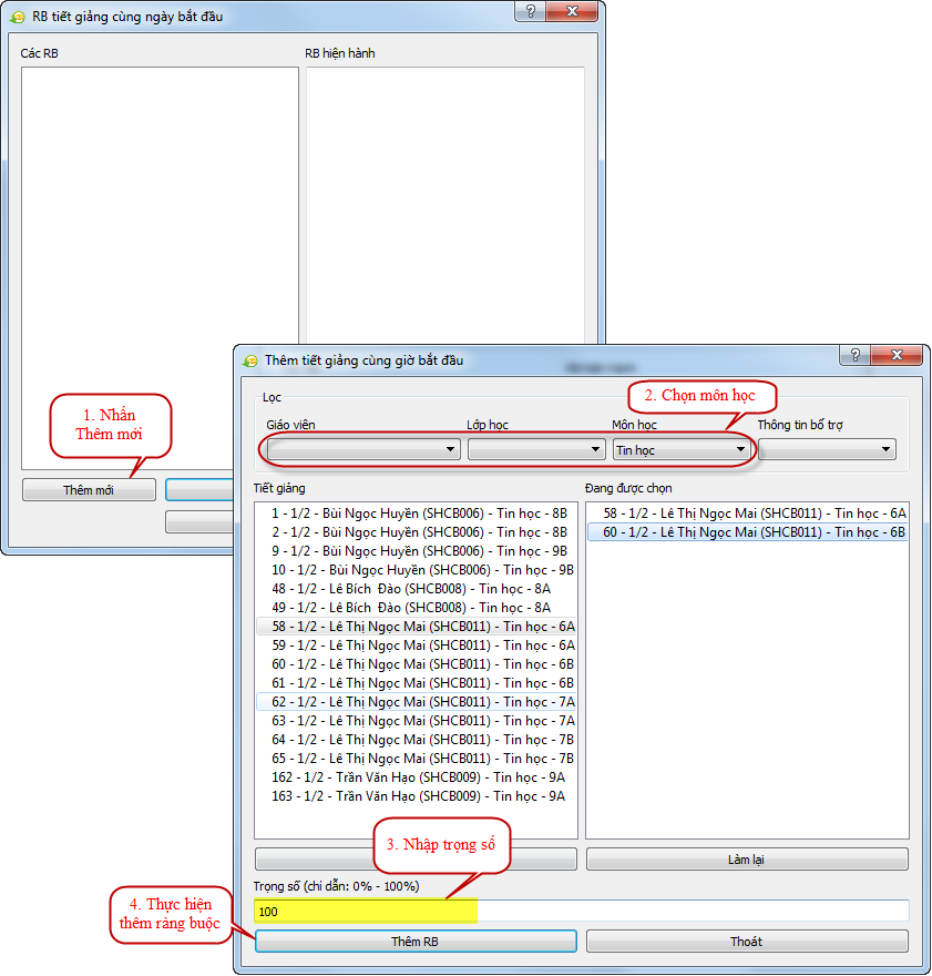 Khi muốn xếp 2 tiết học liền nhau của 2 môn khác nhau không cần theo thứ tự, thì cần thiết lập như sau: