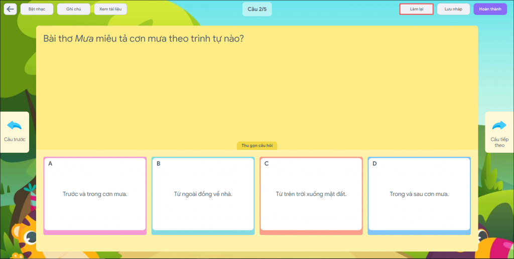 - Tại màn hình làm bài tập, học sinh chọn Làm lại.