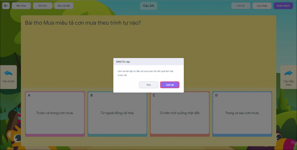 - Học sinh đọc kỹ thông báo và nhấn Xác nhận muốn làm lại bài.