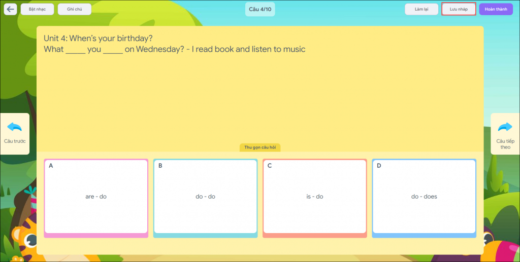 • Ngoài ra, nếu quá trình làm bài học sinh chủ động thoát khỏi phần mềm, có thể chọn Lưu nháp để có thể mở lại và tiếp tục làm bài tập đó.