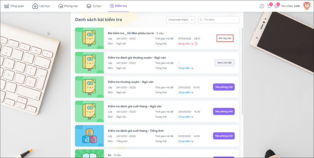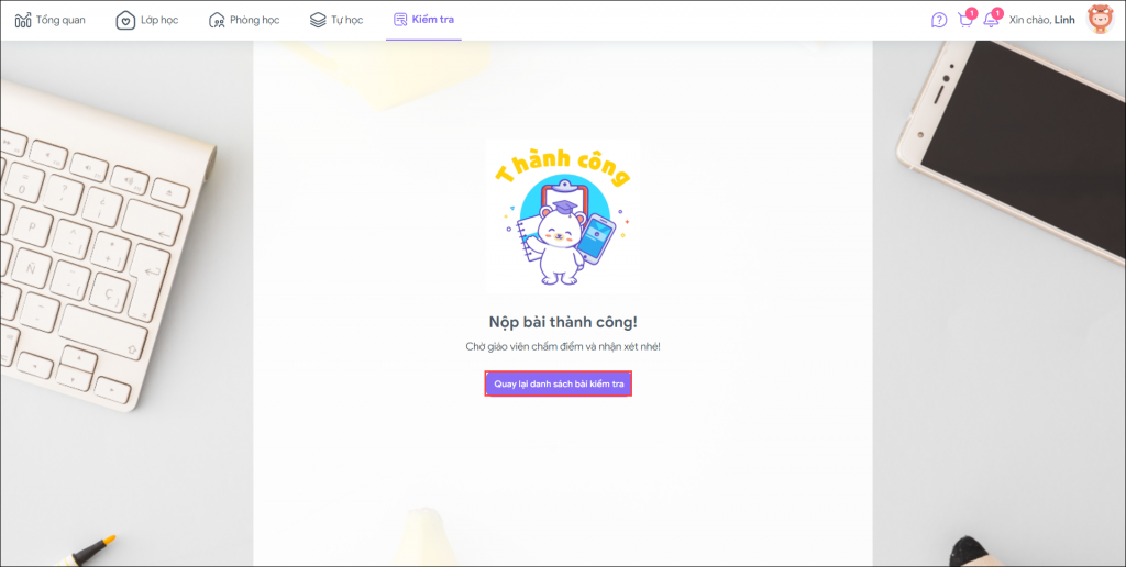 - Màn hình hiển thị thông báo nộp bài thành công, học sinh có thể chọn Quay lại danh sách bài kiểm tra để kiểm tra trạng thái nộp bài.