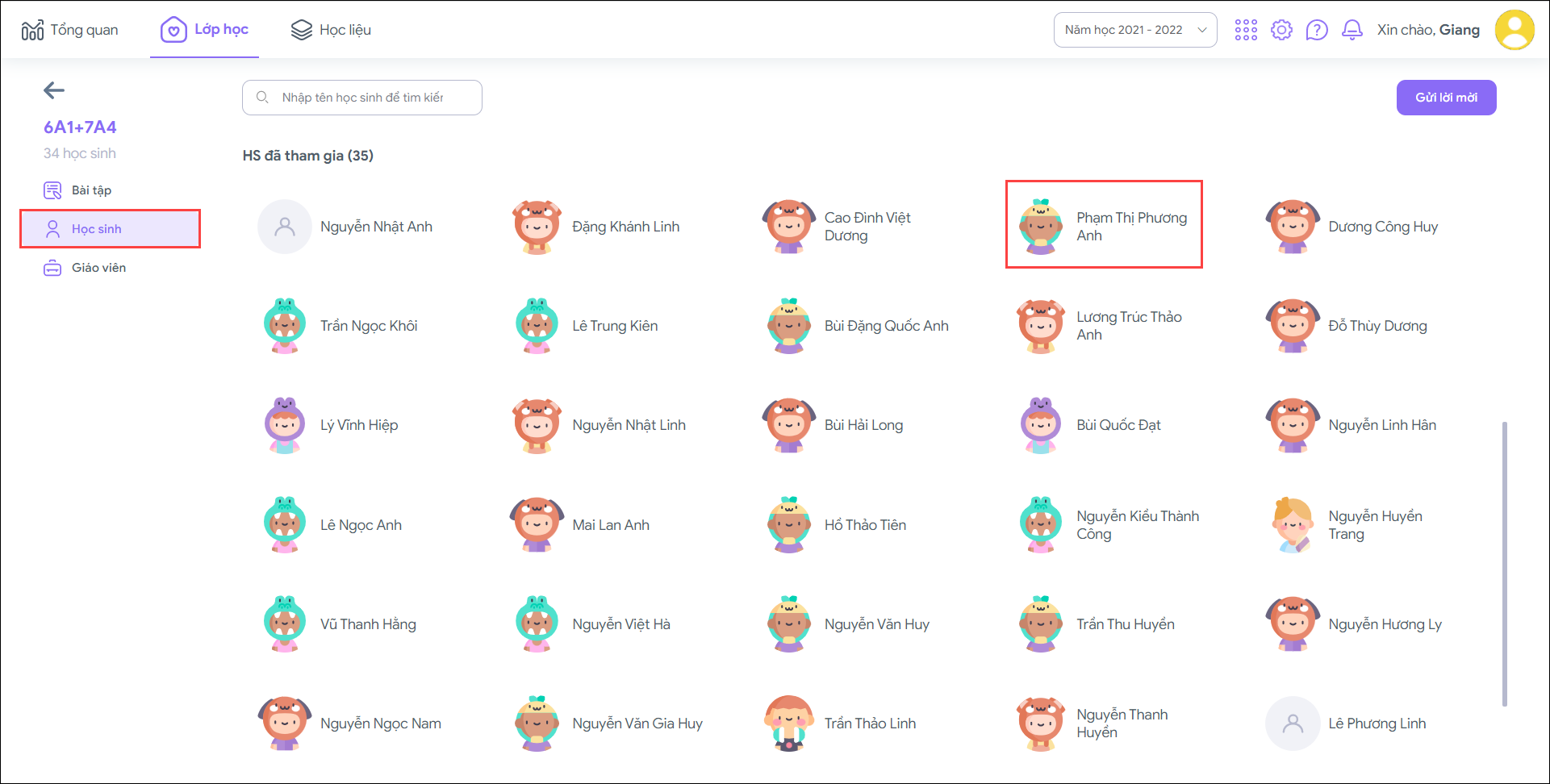 2. Chọn Học sinh để xem danh sách học sinh của lớp, chọn tên học sinh cần xóa khỏi lớp.