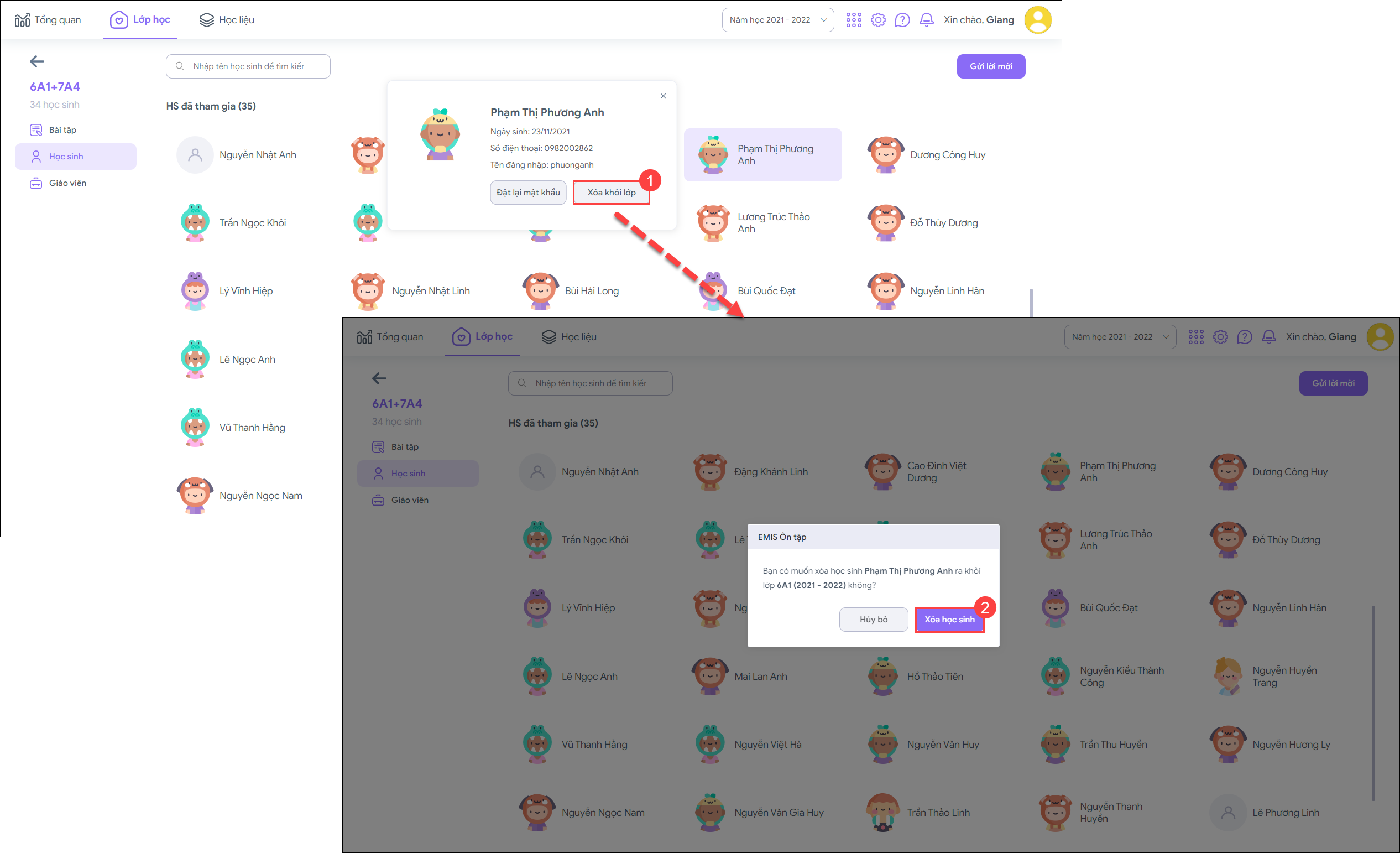 3. Chọn Xóa khỏi lớp, giáo viên vui lòng xác nhận Xóa học sinh khỏi danh sách lớp.
