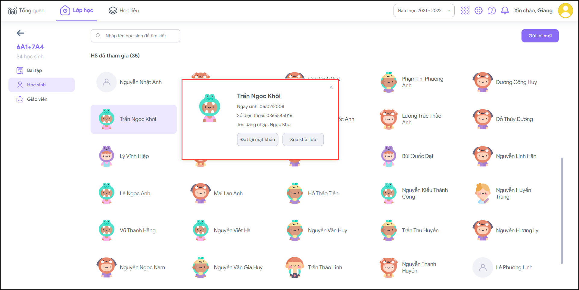 Khi có học sinh tham gia lớp học, bằng cách nhấn chọn tên học sinh, giáo viên có thể theo dõi các thông tin sau: