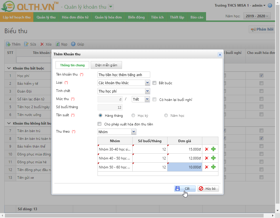 • Nhấn Thêm và lập khoản thu với mức thu theo Tiết, thiết lập các nhóm cần thu. Nhấn CấtLưu ý: Đây là các khoản thu tự nguyện không mang tính chất bắt buộc