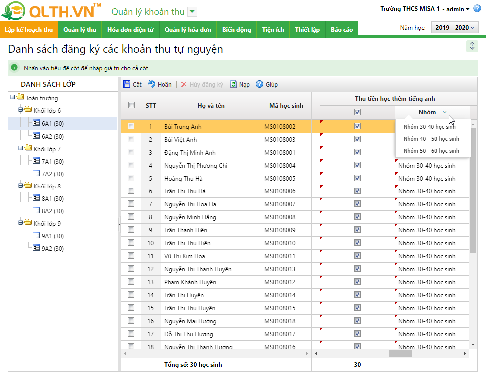 • Phần mềm tự động tính số tiền theo đúng danh sách học sinh đăng ký.