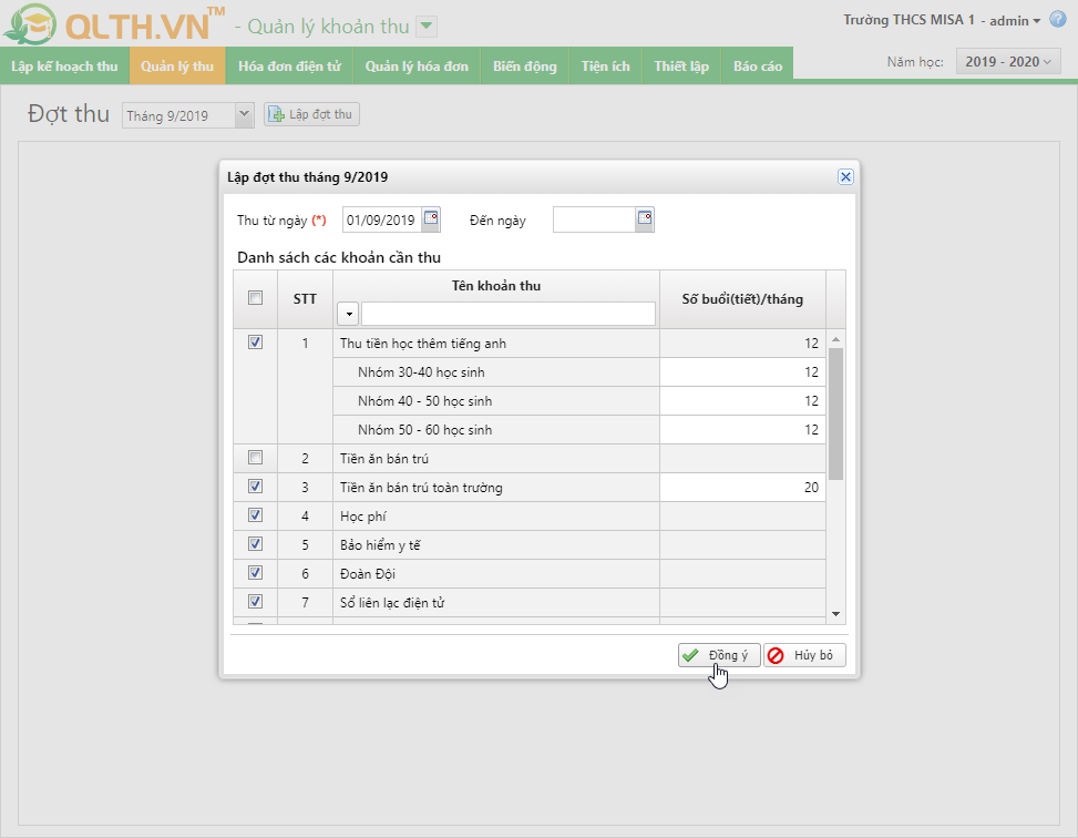 • Vào menu Quản lý thu\Đợt thu. Lập đợt thu cho toàn trường trong đó có khoản thu vừa thiết lập. Nhấn Đồng ý.