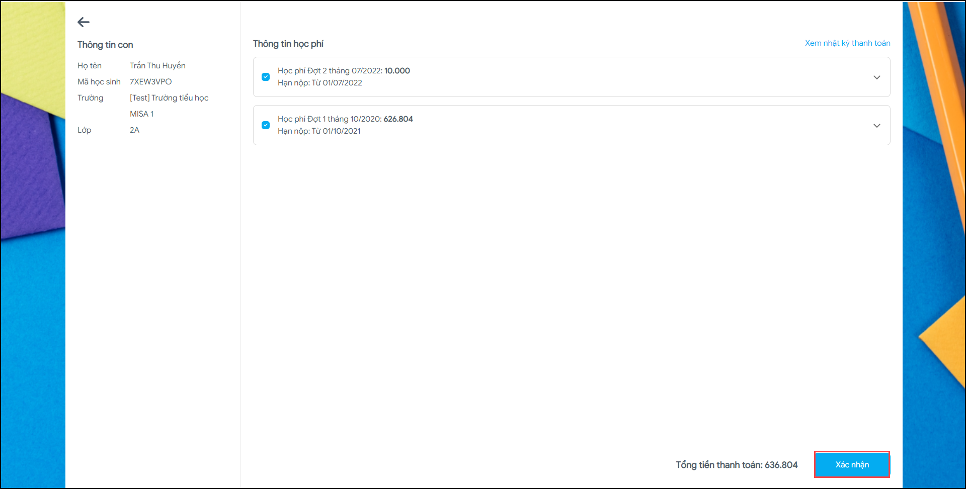 - Chọn Xác nhận để thanh toán tiền học trực tuyến cho con.