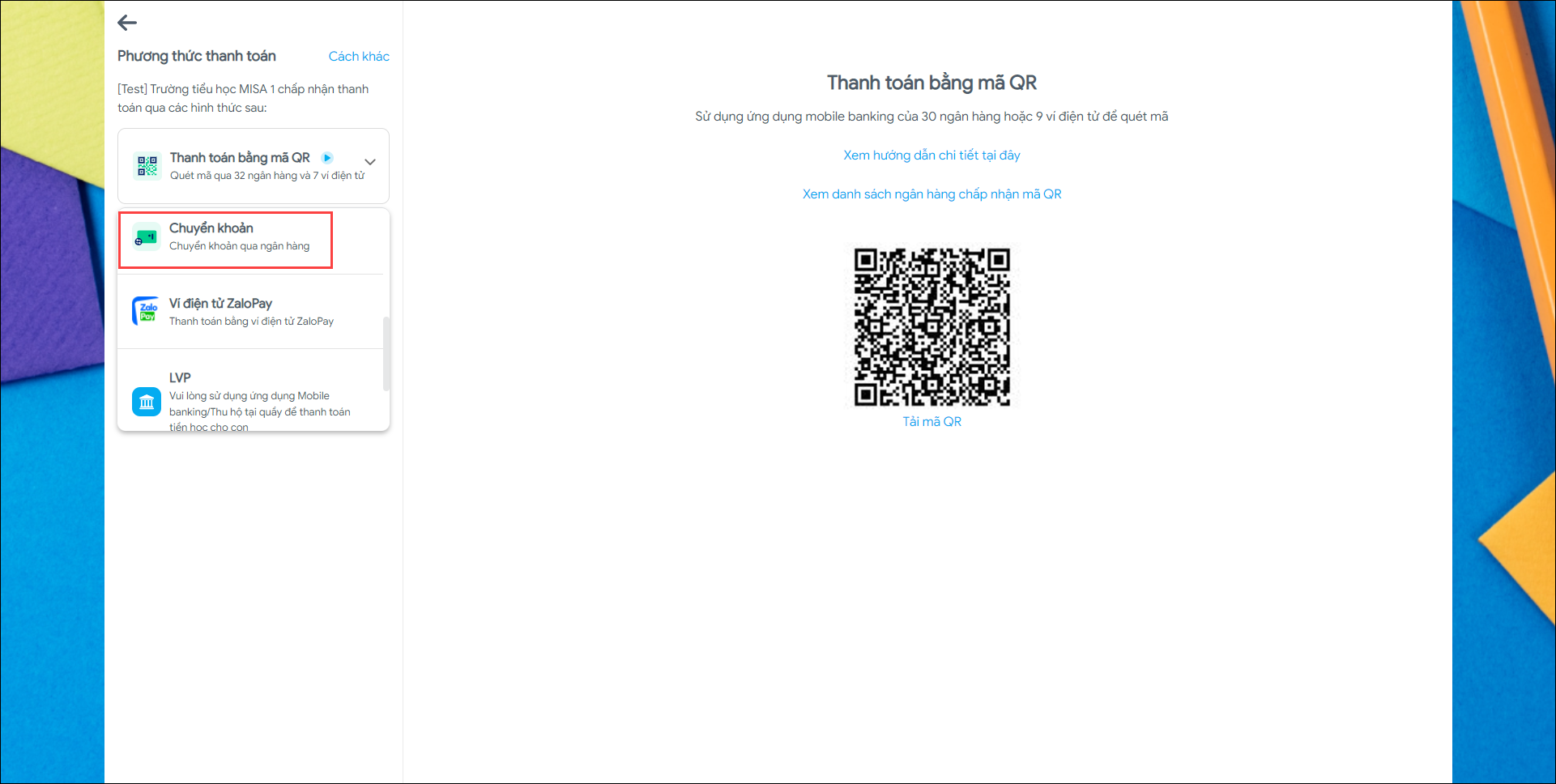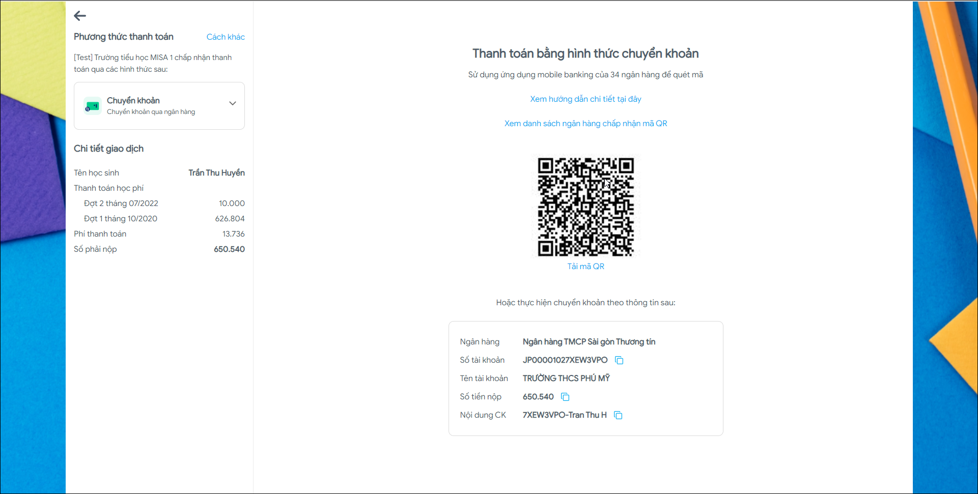 - Màn hình hiển thị Mã QR hoặc thông tin giao dịch để Phụ huynh chuyển khoản.