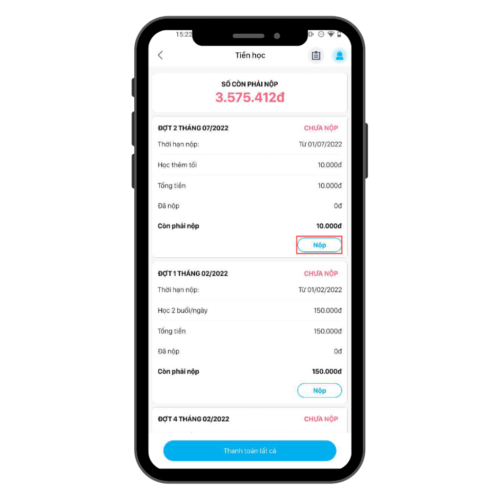 - Với những đợt thu Chưa nộp, Phụ huynh nhấn Nộp để thanh toán tiền học. Trường hợp muốn thanh toán tất cả đợt thu, phụ huynh nhấn Nộp nhiều đợt.