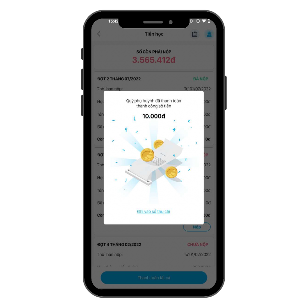 - Màn hình hiển thị thông báo thanh toán tiền học thành công.