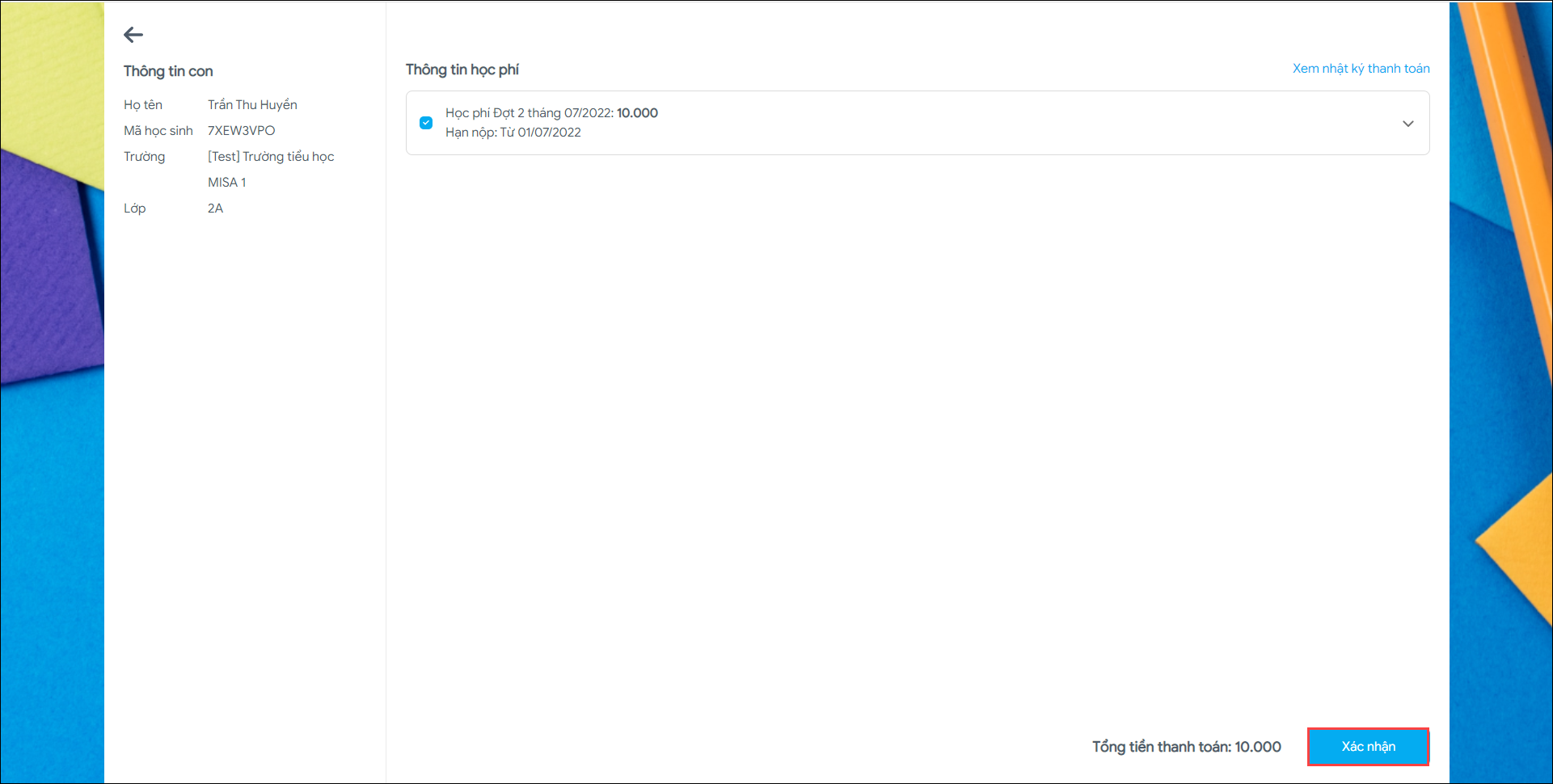 - Chọn Xác nhận để thanh toán tiền học trực tuyến cho con.
