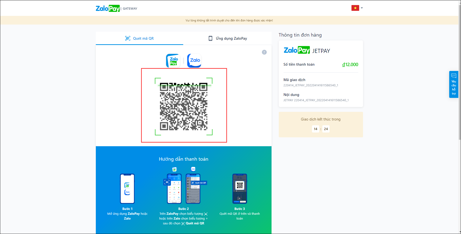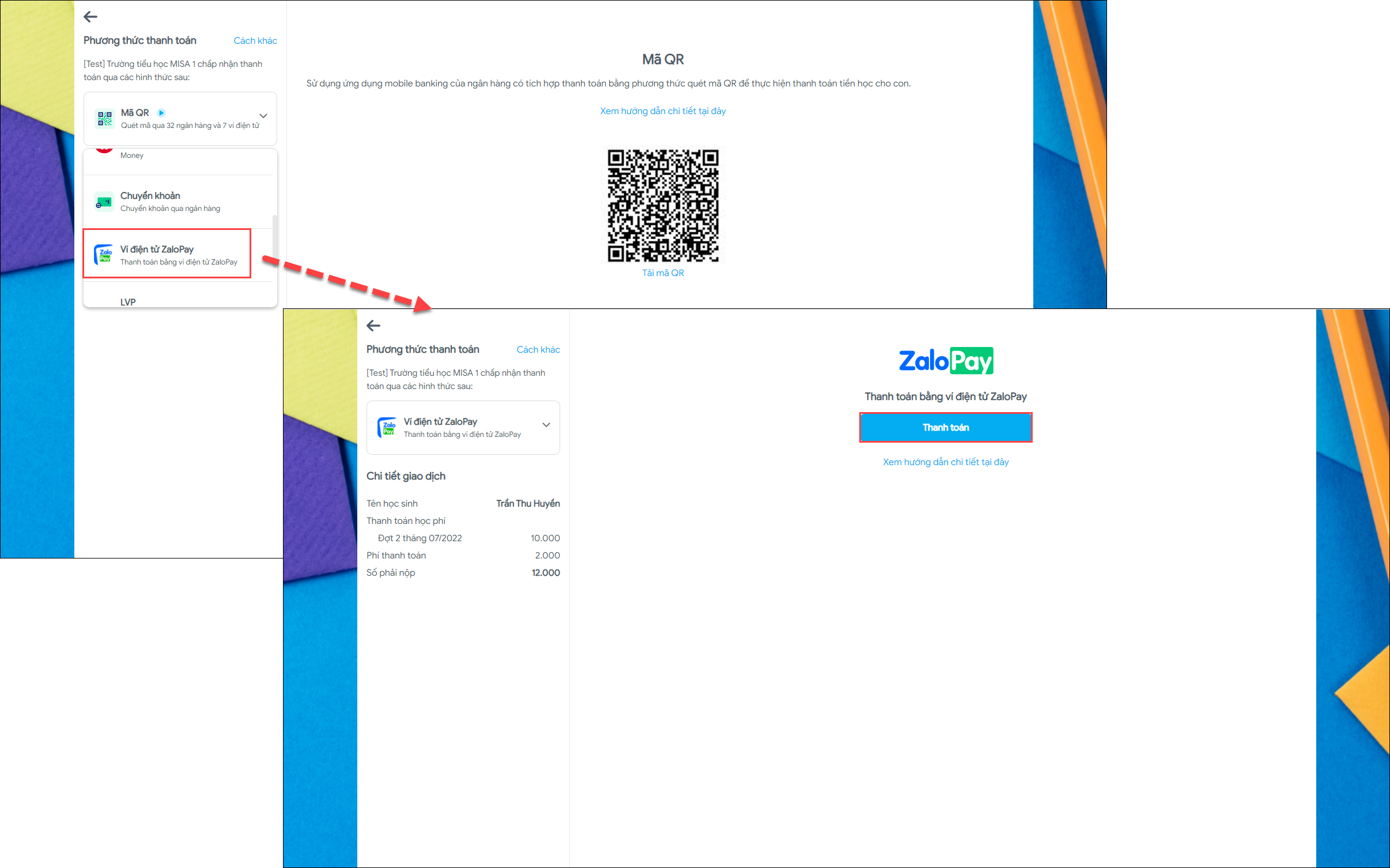 - Màn hình hiển thị Mã QR để Phụ huynh thanh toán qua ZaloPay.