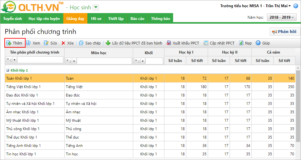 - Khai báo thông tin về môn học, khối học, tên phân phối chương trình cần thêm.