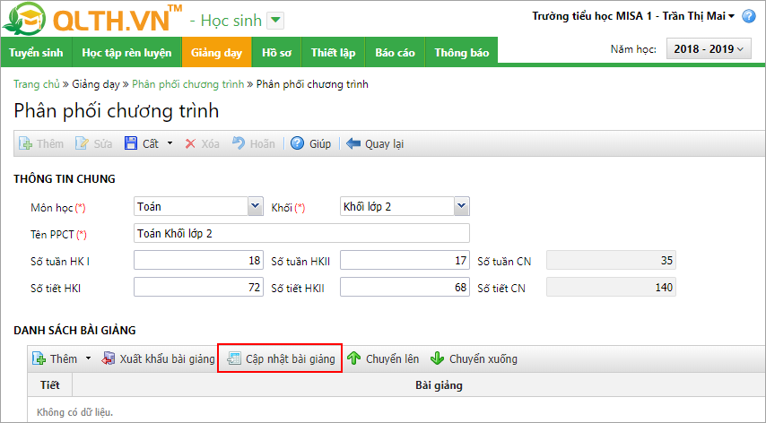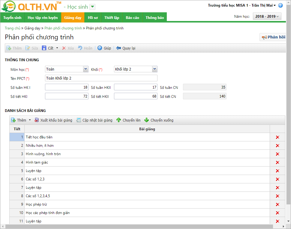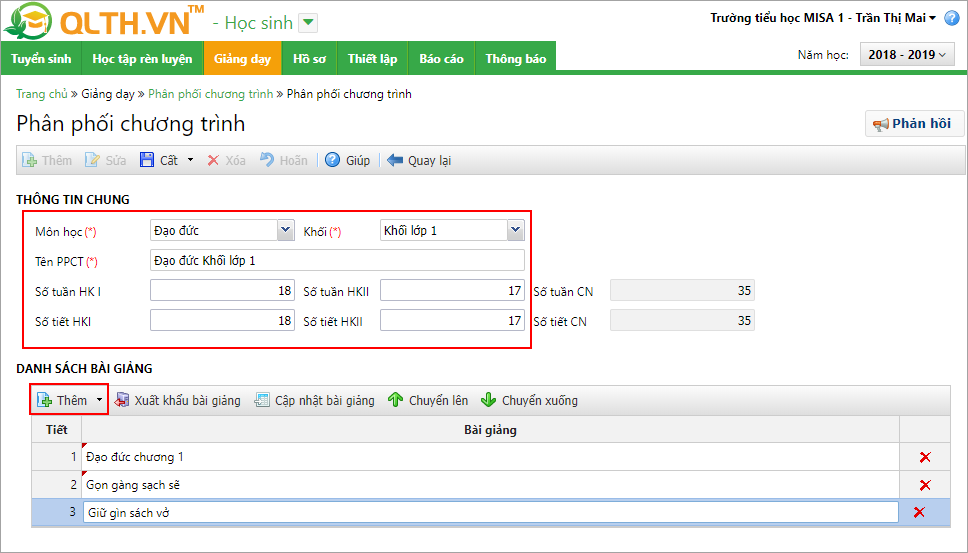 - Nhấn Thêm để khai báo chi tiết số tiết và bài học tương ứng cho từng tiết.