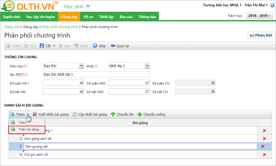 Lưu ý: Có thể chèn thông tin một bài học vào giữa chương trình đang khai báo bằng cách chọn bài học được thiết lập phát sinh trước bài học cần chèn, sau đó chọn chức năng Thêm tại dòng.