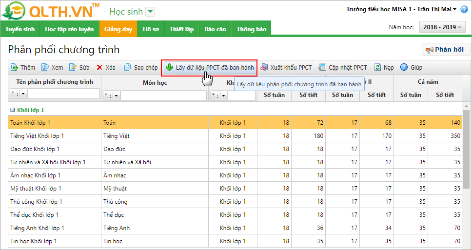 Giúp nhà trường thiết lập phân phối chương trình (PPCT). PPCT của QLTH.VN đã được hệ thống mặc định (dựa vào thông tin Cấp trường) tương ứng theo nhu cầu giảng dạy tại trường. Có thể khai báo phân phối chương trình bằng những cách sau: