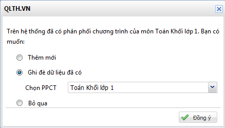 Lưu ý: Nếu trên tệp excel có môn và tiết phân phối chương trình trùng với môn và tiết phân phối chương trình đã có trên phần mềm, sau khi nhấn Thực hiện phần mềm sẽ cho phép lựa chọn 1 trong 3 cách xử lý sau: