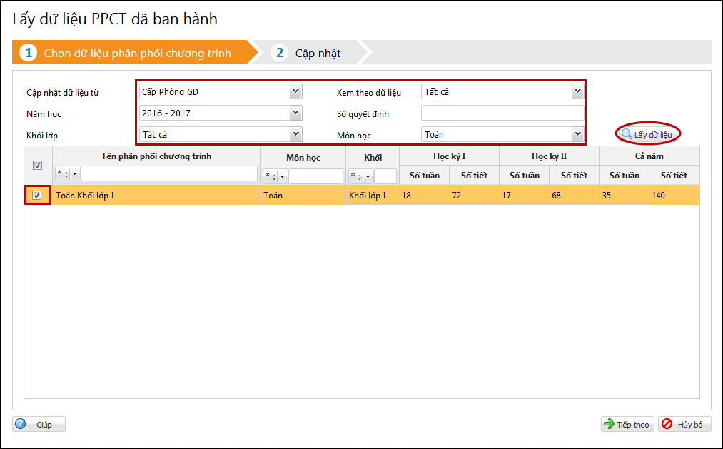 2. Chọn cấp ban hành phân phối chương trình và khai báo các thông tin để lọc ra phân phối chương trình cần lập.