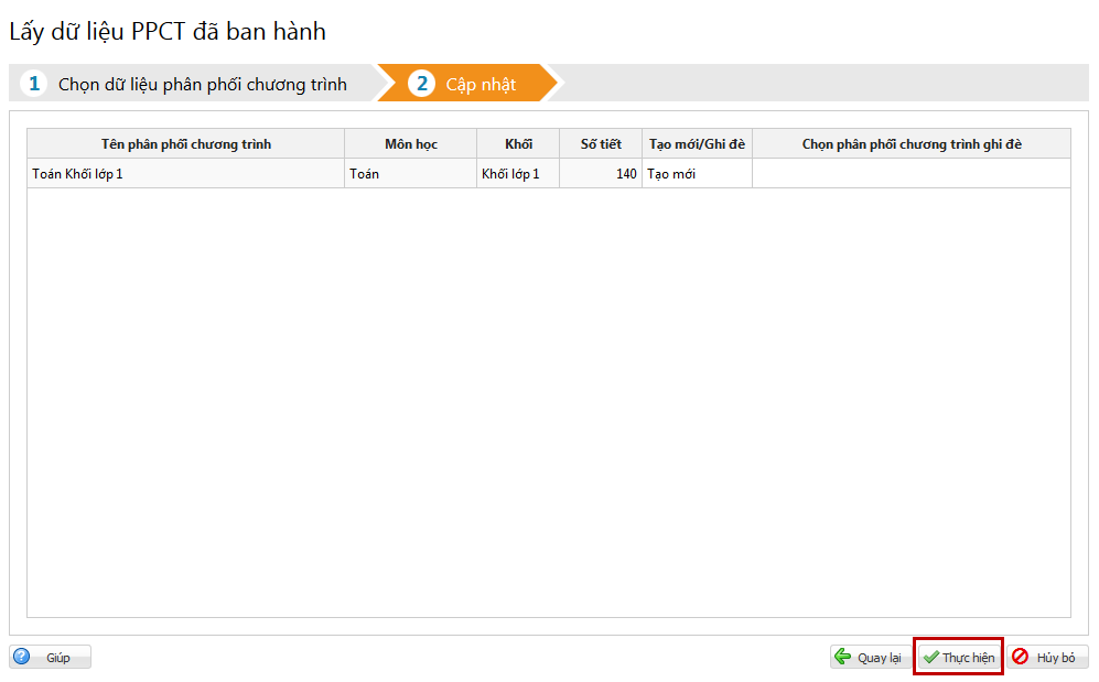 - Nếu chọn Ghi đè, hệ thống sẽ tự động cập nhật thông tin của phân phối chương trình được lấy vào thông tin phân phối chương trình được chọn ở cột Chọn phân phối chương trình ghi đè