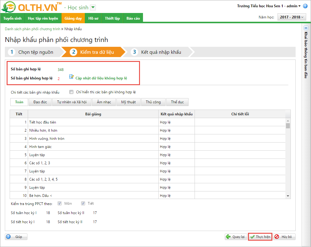 8. Nhấn Tiếp theo. Tại bước Kiểm tra dữ liệu, hệ thống sẽ chỉ ra bao nhiêu dữ liệu hợp lệ, bao nhiêu dữ liệu không hợp lệ.