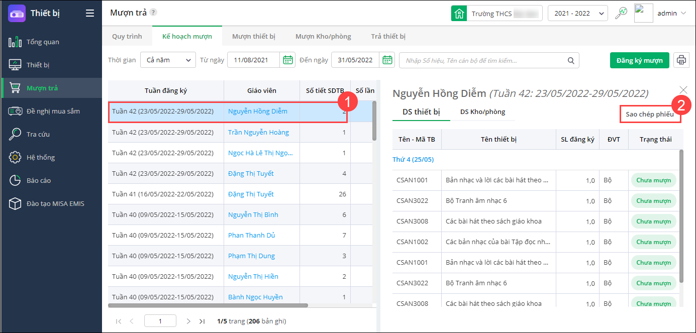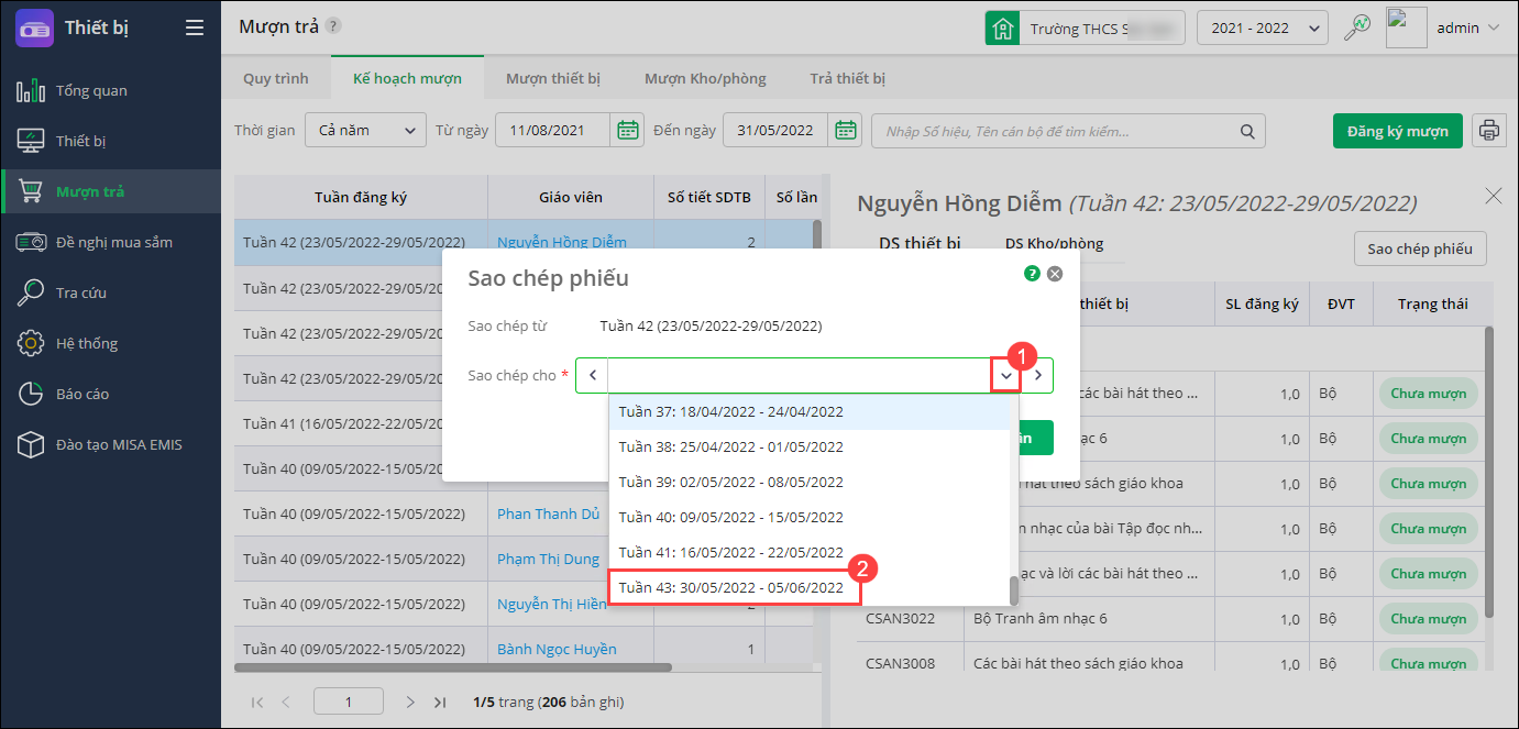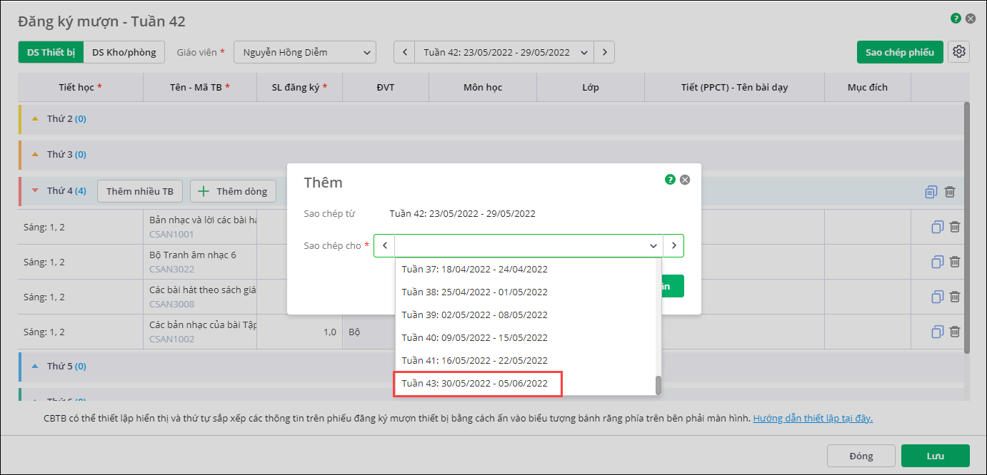 - Chọn tuần đăng ký thầy cô muốn sao chép phiếu mượn thiết bị, chọn Sao chép phiếu.