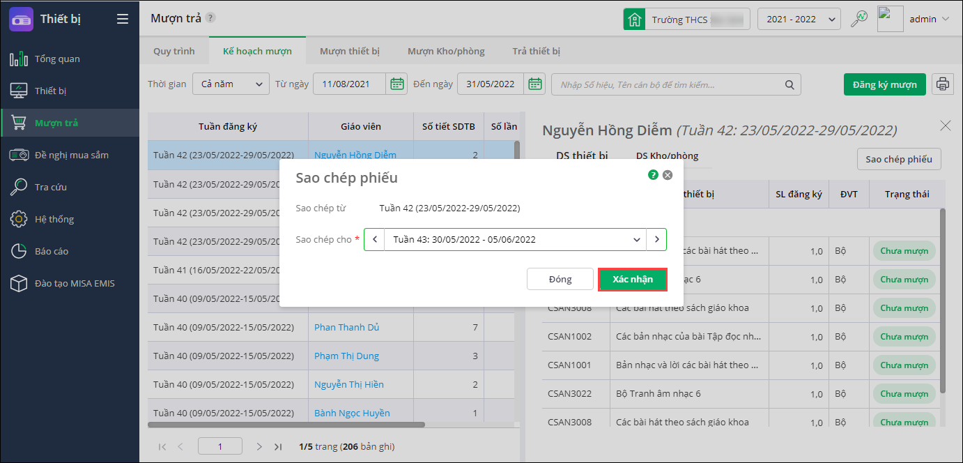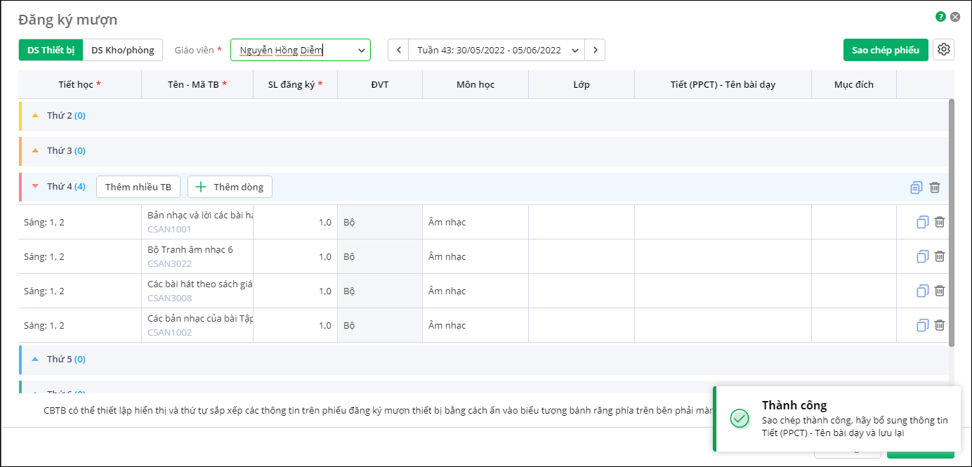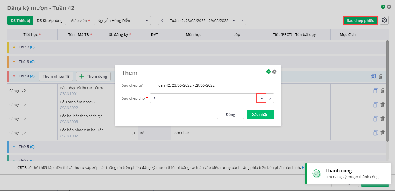 Lưu ý: Thầy cô có thể chọn sao chép đến nhiều tuần trong trường hợp không chọn hiển thị thông tin Tiết (PPCT) – Tên bài dạy trong mục Thiết lập phiếu đăng ký mượn. - Nhấn Xác nhận, sau khi sao chép thành công, thầy cô có thể xem lại thông tin và bổ sung thông tin như: Tiết (PPCT) – Tên bài dạy, Lớp, Mục đích,…