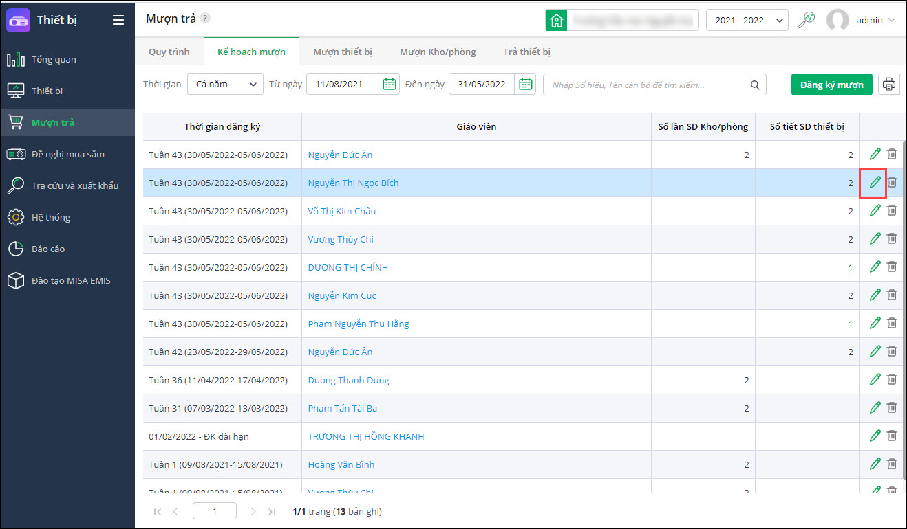 - Tại phiếu mượn thiết bị cần sao, chọn vào biểu tượng cây bút để chỉnh sửa phiếu mượn.