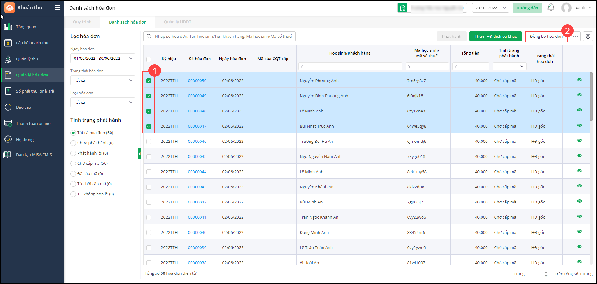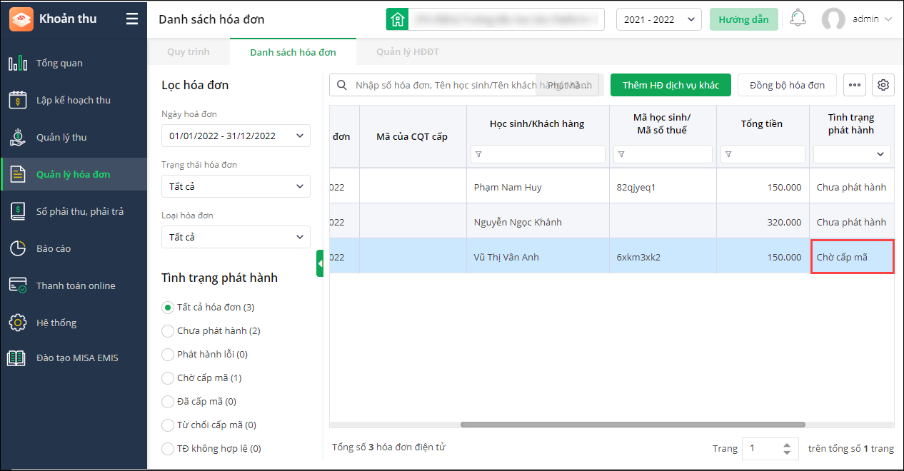 Trường hợp Cơ quan thuế đã cấp mã nhưng phần mềm meInvoice chưa cập nhật và để trạng thái là Chờ cấp mã trên Khoản thu.