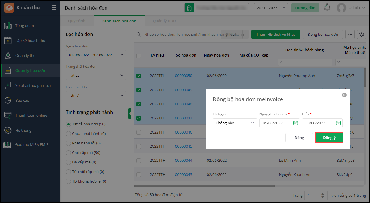 2. Chọn thời gian để đồng bộ hóa đơn trên meInvoice, nhấn Đồng ý.