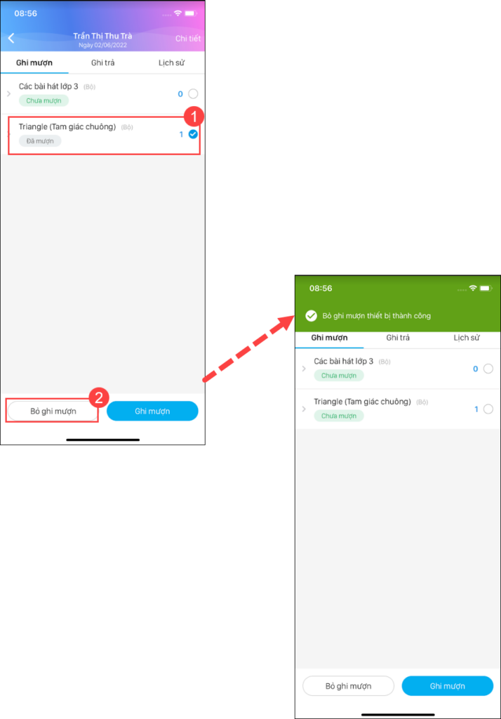 - Tại mục Lịch sử, chọn thiết bị cần bỏ ghi trả