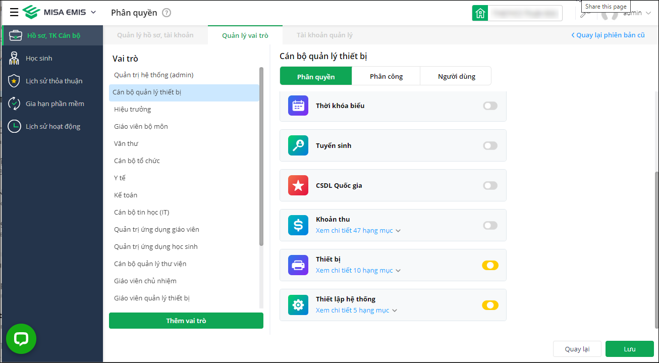 Bước 2: Sau khi hoàn tất tạo tài khoản cho cán bộ, giáo viên nhà trường, anh/chị thực hiện phân quyền và phân công cho tài khoản cán bộ, giáo viên tương ứng tại mục Quản lý vai trò theo hướng dẫn tại đây.