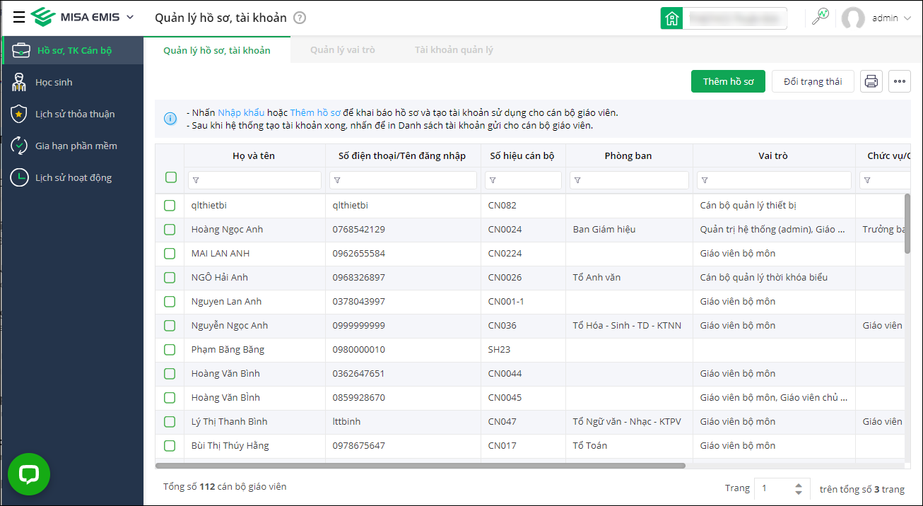 Bước 1: Cán bộ tin học của trường vào Tài khoản cán bộ\ Hồ sơ, TK cán bộ và thực hiện tạo tài khoản cho cán bộ, giáo viên nhà trường theo hướng dẫn tại đây.