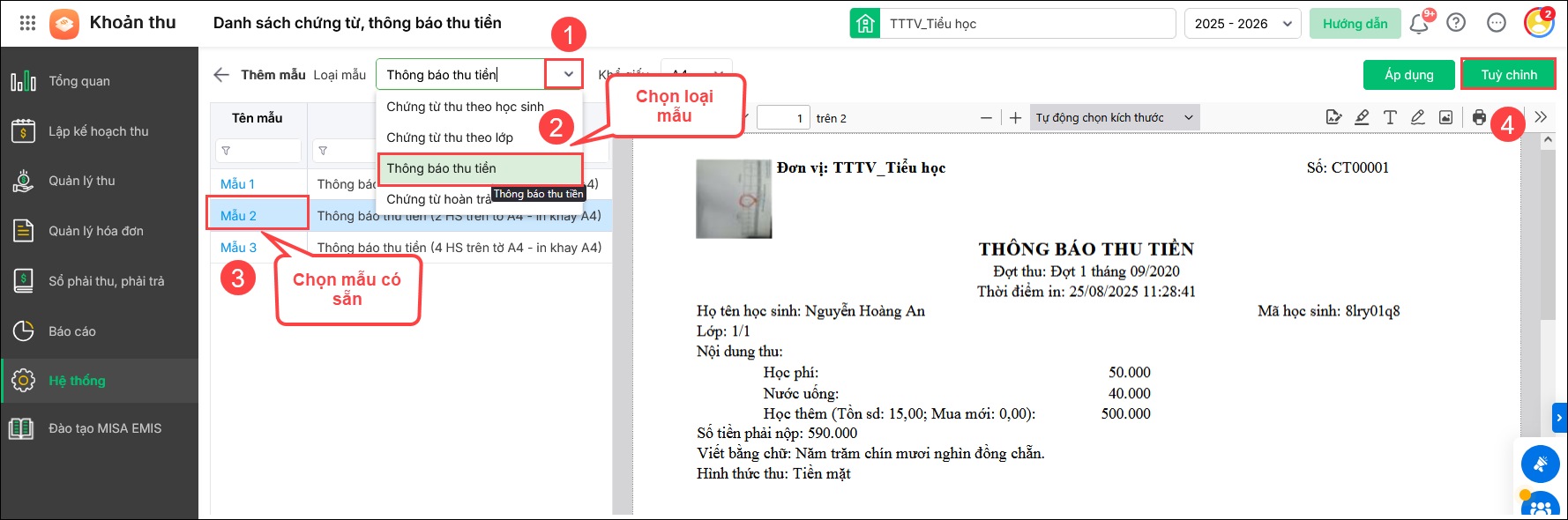 - Lựa chọn loại mẫu bằng cách chọn vào dấu mũi tên. Ví dụ chọn mẫu: Thông báo thu tiền