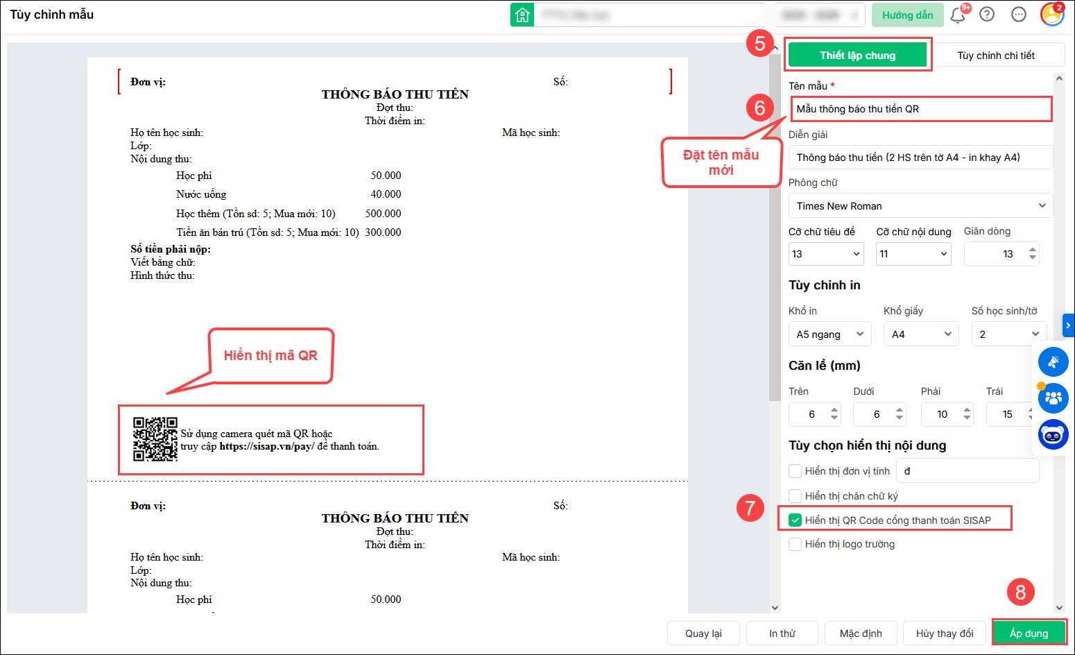 - Tên mẫu: Đặt tên mới cho mẫu. Ví dụ: Mẫu thông báo thu tiền QR