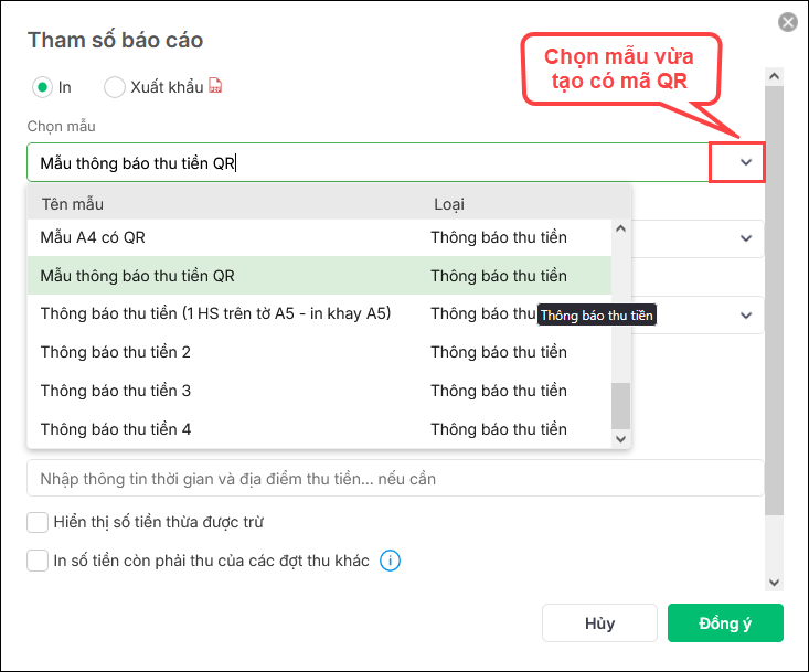 Lưu ý: Đối với chứng từ thu tiền theo học sinh, bạn có thể thiết lập tương tự để hiển thị mã QR lên chứng từ (nếu cần)