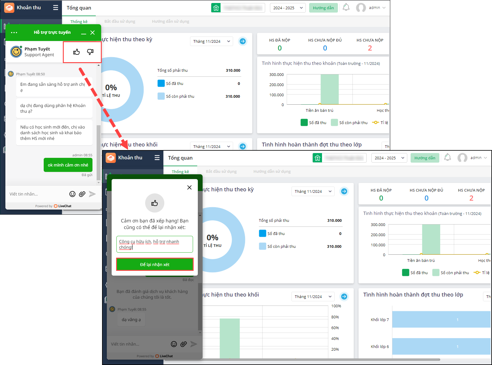 - Sau khi được hỗ trợ, anh/chị có thể đánh giá tư vấn viên ngay trên khung chat và để lại nhận xét để nâng cao chất lượng dịch vụ.