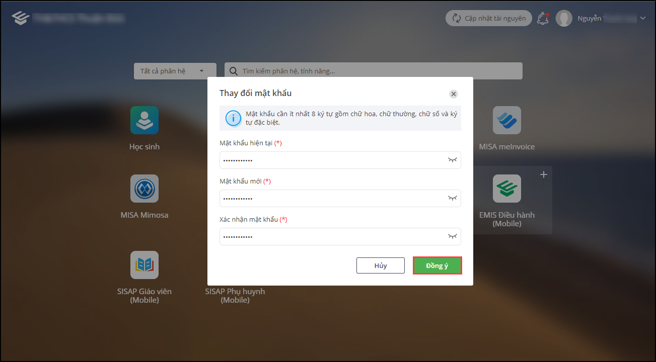 2. Thay đổi mật khẩu bằng cách nhập mật khẩu cũ và mật khẩu mới vào ô tương ứng. Chọn Đồng ý.