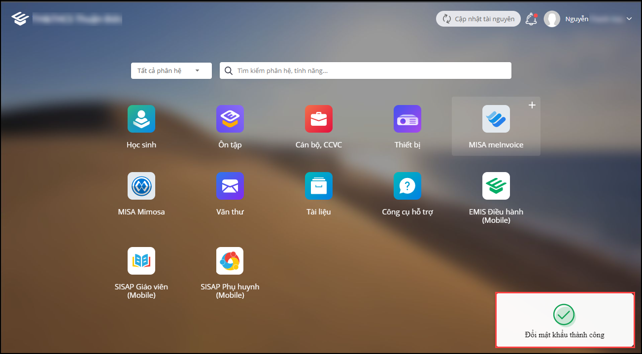 3. Phần mềm hiển thị thông báo xác nhận đổi mật khẩu thành công.