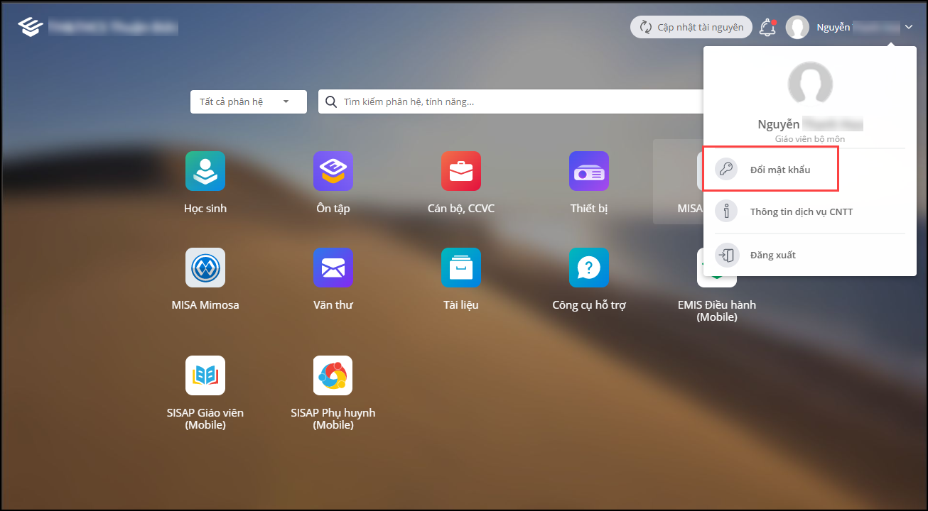 1. Sau khi đăng nhập, nhấn chọn vào tên tài khoản tại góc phải màn hình. Chọn Đổi mật khẩu.
