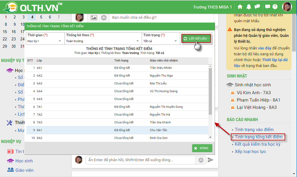 Cho phép hiệu trưởng có thể thực hiện thống kê nhanh được tình trạng ghi nhận điểm tổng kết trung bình môn của từng lớp ngay tại màn hình Tin tức để đốc thúc và nhắc nhở giáo viên chủ nhiệm tính điểm và ghi nhận kịp thời.