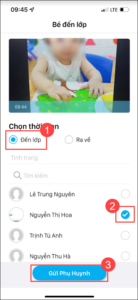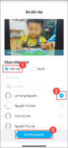 - Chọn thời gian (Đến lớp hay Ra về), tích chọn tên học sinh tương ứng và nhấn Gửi Phụ Huynh.
