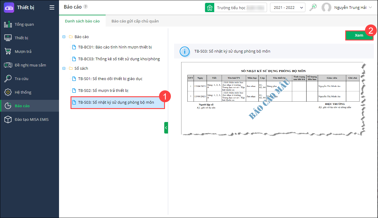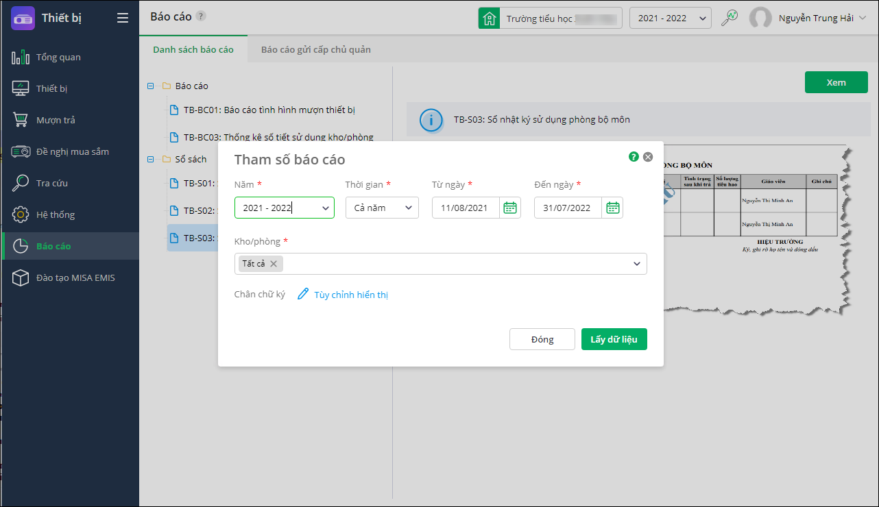 - Vào Thiết bị\Báo cáo, chọn TB-S03: Sổ nhật ký sử dụng phòng bộ môn.