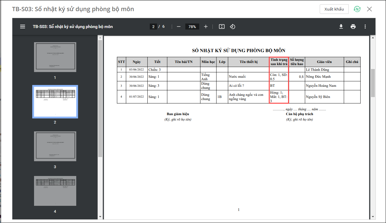 Lưu ý: Cán bộ thiết bị nhanh chóng nắm bắt tình trạng thiết bị sau khi trả để báo cáo ngay tại cột Tình trạng thiết bị khi trả: Hỏng, Mất, BT (Bình thường), Còn, SD (Sử dụng).
