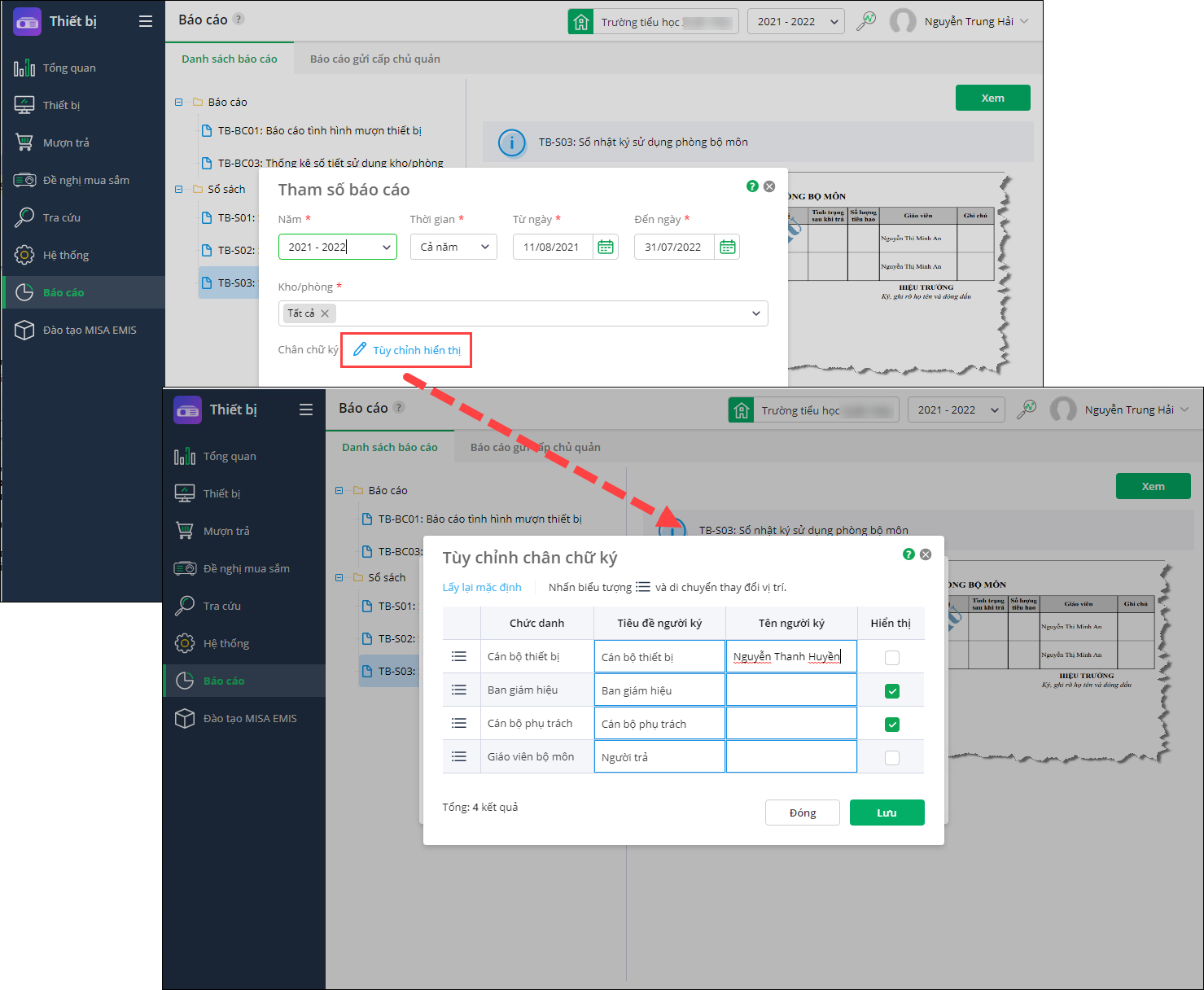 - Chân chữ ký: Cho phép tùy chỉnh hiển thị chữ ký tại số báo cáo.