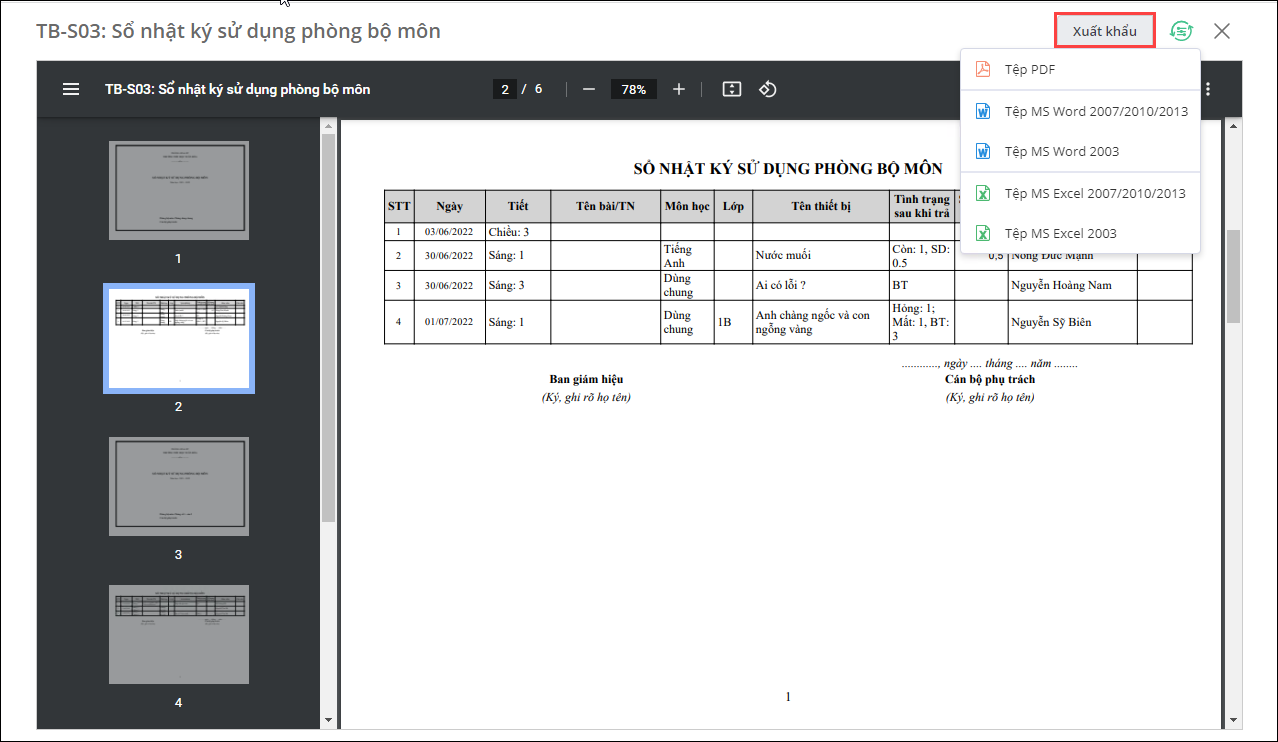 - Vào Thiết bị\Báo cáo, chọn TB-S03: Sổ nhật ký sử dụng phòng bộ môn.