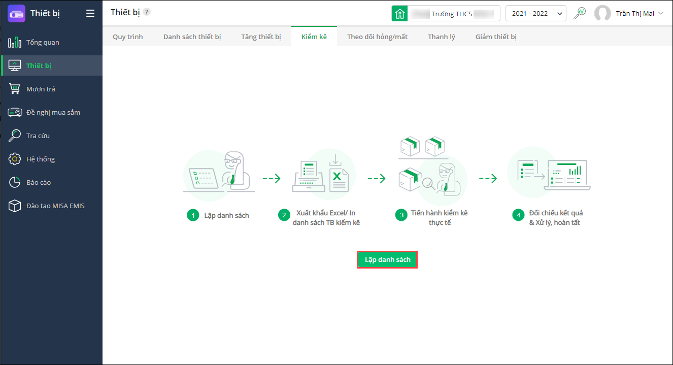 - Vào Thiết bị\Kiểm kê, chọn Lập danh sách để bắt đầu kiểm kê.